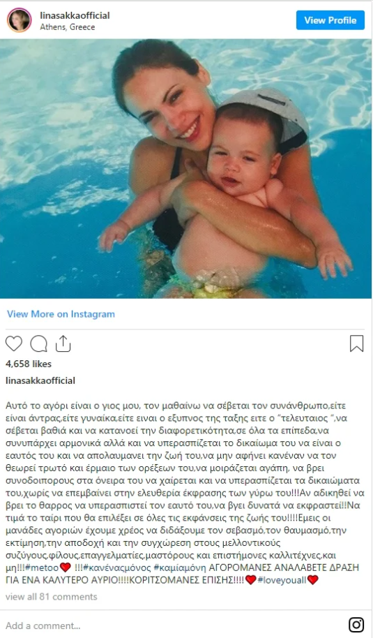 Η Λίνα Σακκά έγραψε επίσης: «Αν αδικηθεί να βρει το θάρρος να υπερασπιστεί τον εαυτό του, να βγει δυνατά να εκφραστεί!! Να τιμά το ταίρι που θα επιλέξει σε όλες τις εκφάνσεις της ζωής του!!!!