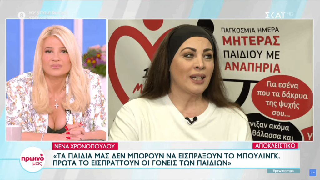 Η Νένα Χρονοπούλου μίλησε στην εκπομπή «Πρωινό μας» και στη δημοσιογράφο Κατερίνα Νινιού. Η ίδια μίλησε μεταξύ άλλων για τον χώρο που έχει δημιουργήσει για τα παιδιά με αναπηρία, το 4amea. Επίσης άνοιξε τη καρδιά της για τον γιο της μέσα από μια κατάθεση ψυχής που συγκλόνισε.