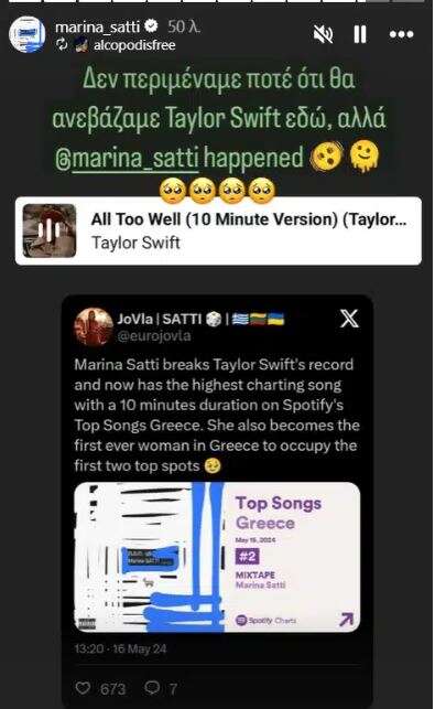 Παράλληλα, σε δεύτερο story της η Μαρίνα Σάττι αναδημοσίευσε μία ανάρτηση, στην οποία ανέφερε πως έσπασε το ρεκόρ της Τέιλορ Σουίφτ στην Ελλάδα και πως το κομμάτι «MIXTAPE» από το νέο άλμπουμ της P.O.P, είναι το τραγούδι με την υψηλότερη διάρκεια 10 λεπτών στο Top Songs Greece του Spotify.