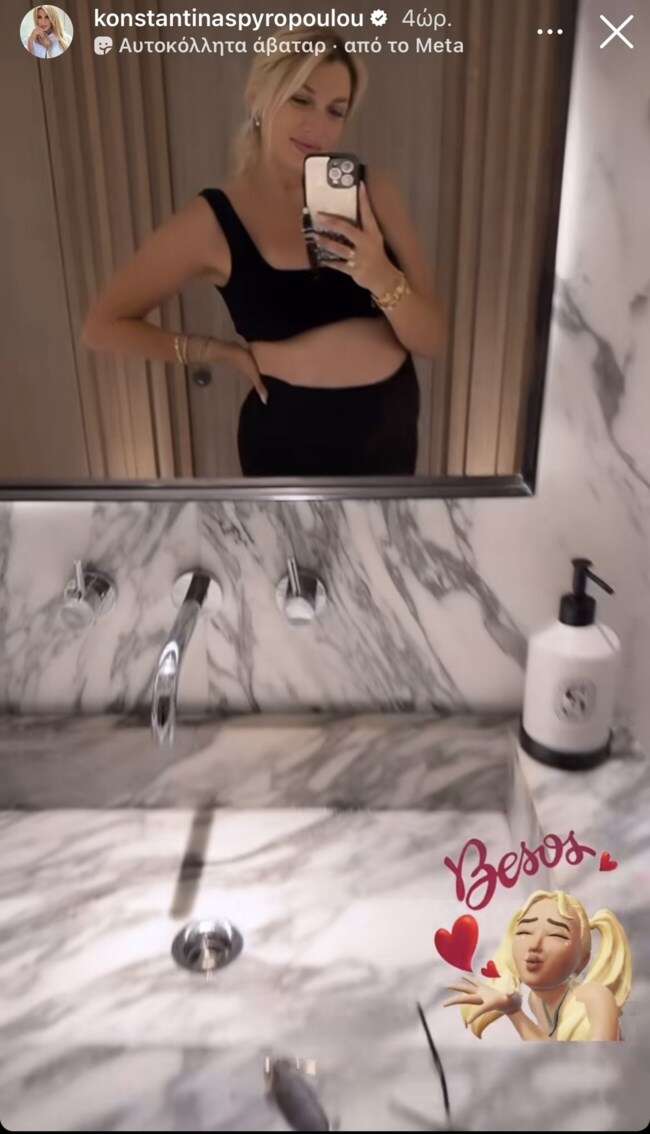 Αργά το απόγευμα της ονομαστική της εορτής, η Κωνσταντίνα Σπυροπούλου δημοσίευσε ένα boomerang στα Instagram stories της, στο οποίο φαινόταν η φουσκωμένη της κοιλίτσα.