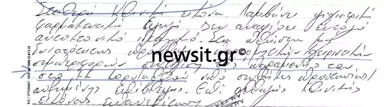 Ο γιατρός κάνει λόγο για «Επιλεκτική αμνησία – δε θυμάται τι συνέβη, θυμάται όπως αναφέρει ότι ξύπνησε στο ασθενοφόρο. Συναίσθημα δονούμενο. Αναφέρει ευχές θανάτου, χωρίς όμως να εκφράζει ενεργό αυτοκτονικό ιδεασμό». Μάλιστα, ο ψυχίατρος επισημαίνει ότι λαμβάνει ψυχιατρική φαρμακευτική αγωγή από το νοσοκομείο Δαφνί και καταλήγει αναφέροντας ότι «Δεν χρήζει άμεσης μεταφοράς στο Ψυχιατρείο Κρατουμένων Κορυδαλλού».