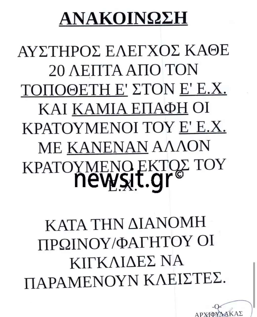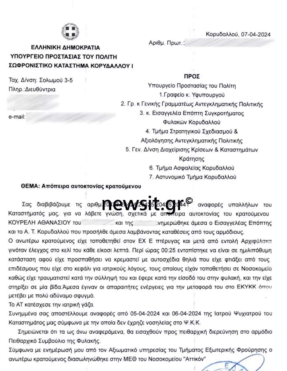 Όπως προκύπτει, από τα επίσημα έγγραφα και τις καταθέσεις των υπαλλήλων του Κορυδαλλού που συμπεριλαμβάνονται στη δικογραφία που σχηματίστηκε, το φρικαλέο σκηνικό, άγριο ξημέρωμα, στις φυλακές Κορυδαλλού, ξεδιπλώνεται ως εξής. «Ο ανωτέρω κρατούμενος, είχε τοποθετηθεί στον ΕΧ , Ε’ πτέρυγα και μετά από εντολή αρχιφύλακα γινόταν έλεγχος στο κελί του κάθε 20 λεπτά. Περί ώρα 00:25, εντοπίστηκε να είναι σε ημιλιπόθυμη κατάσταση, αφού είχε προσπαθήσει να κρεμαστεί με αυτοσχέδια θηλιά που είχε φτιάξει από τους επιδέσμους που είχε στο κεφάλι για ιατρικούς λόγους, τους οποίους είχαν τοποθετήσει σε νοσοκομείο καθώς και τραυματιστεί κατά την σύλληψη του και έφερε κατά την είσοδο του στη φυλακή και την είχε στηρίξει σε μία βίδα. Άμεσα έγιναν οι απαραίτητες ενέργειες για την μεταφορά του όπου μετέβη με πολύ αδύναμο σφυγμό. Το Α.Τ κατέσχεσε την ιατρική γάζα». Στις επόμενες γραμμές του εγγράφου που παρουσιάζει το newsit.gr, επισημαίνεται ότι στα συνημμένα που απέστειλε η διεύθυνση των φυλακών στο νοσοκομείο και τα οποία συμπεριλαμβάνονται στη δικογραφία, μετά από δύο γνωματεύσεις ψυχιάτρων, ο συγκεκριμένος άντρας είχε μεταφερθεί σε κελί καθώς δεν έχριζε νοσηλείας στο Ψυχιατρικό Κατάστημα των φυλακών Κορυδαλλού.
