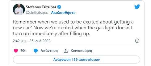 «Θυμάστε όταν ήμασταν ενθουσιασμένοι με το να πάρουμε ένα νέο αυτοκίνητο; Τώρα είμαστε ενθουσιασμένοι όταν το λαμπάκι της βενζίνης δεν ανάβει αμέσως μετά το γέμισμα» έγραψε ο Στέφανος Τσιτσιπάς και τα σχόλια πήραν φωτιά.