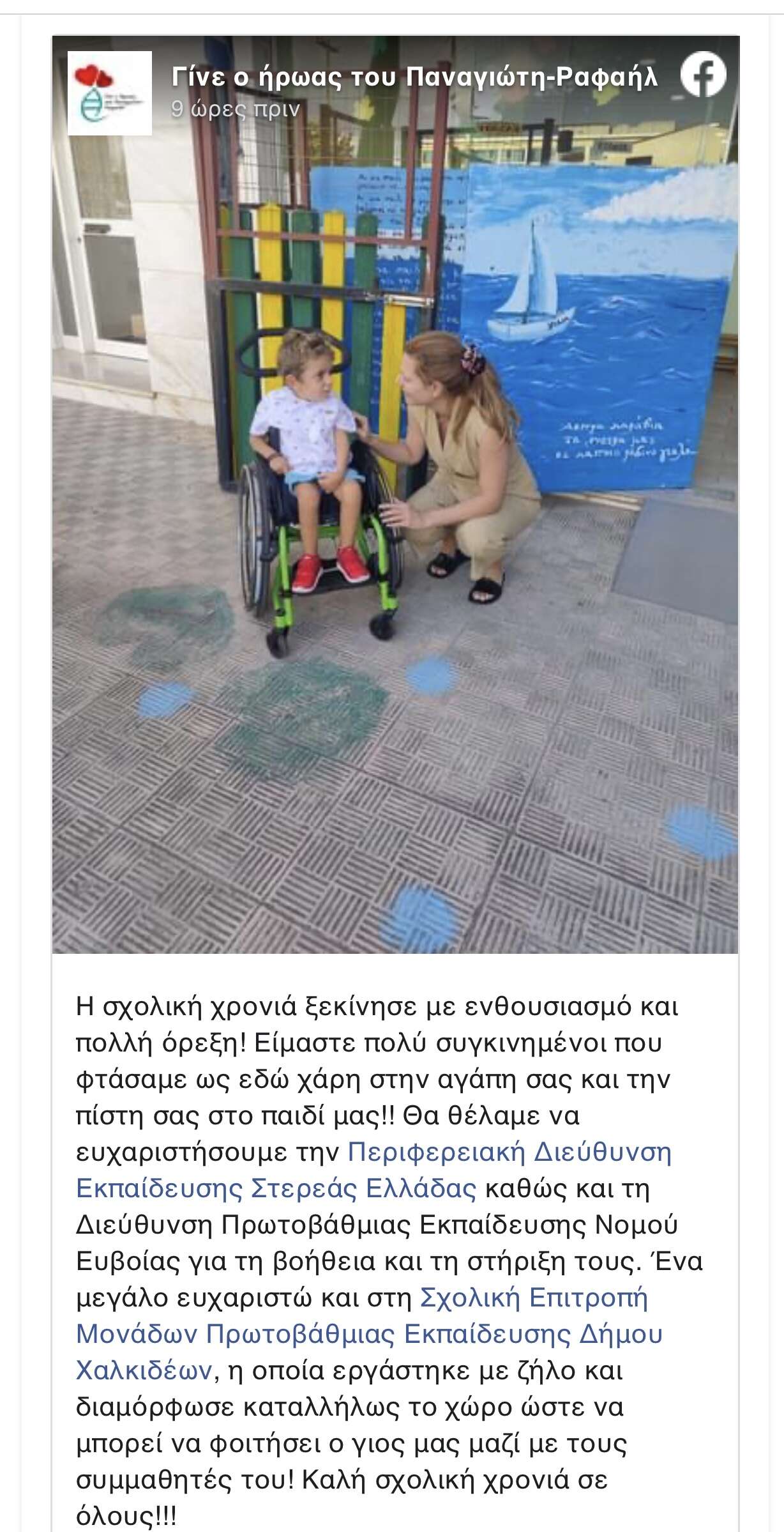 «Η σχολική χρονιά ξεκίνησε με ενθουσιασμό και πολλή όρεξη! Είμαστε πολύ συγκινημένοι που φτάσαμε ως εδώ χάρη στην αγάπη σας και την πίστη σας στο παιδί μας!! Θα θέλαμε να ευχαριστήσουμε την Περιφερειακή Διεύθυνση Εκπαίδευσης Στερεάς Ελλάδας καθώς και τη Διεύθυνση Πρωτοβάθμιας Εκπαίδευσης Νομού Ευβοίας για τη βοήθεια και τη στήριξη τους. Ένα μεγάλο ευχαριστώ και στη Σχολική Επιτροπή Μονάδων Πρωτοβάθμιας Εκπαίδευσης Δήμου Χαλκιδέων, η οποία εργάστηκε με ζήλο και διαμόρφωσε καταλλήλως το χώρο ώστε να μπορεί να φοιτήσει ο γιος μας μαζί με τους συμμαθητές του! Καλή σχολική χρονιά σε όλους!!!