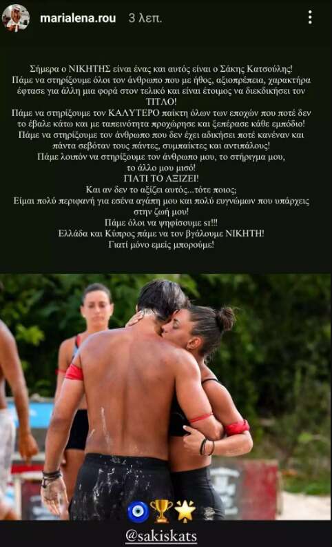 «Σήμερα ο νικητής είναι ένας και αυτός είναι ο Σάκης Κατσούλης! Πάμε να στηρίξουμε όλοι τον άνθρωπο που με ήθος, αξιοπρέπεια, χαρακτήρα, έφτασε για άλλη μια φορά στο τελικό και είναι έτοιμος να διεκδικήσει τον τίτλο.