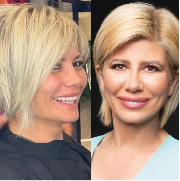 Η Ζήνα Κουτσελίνη ανέβασε 2 φωτογραφίες δίπλα δίπλα στις οποίες στην μία είναι η ίδια και στην άλλη φωτογραφία η σωσίας της με κοντό ξανθό μαλλί για να μπορούμε να κάνουμε και την σύγκριση.