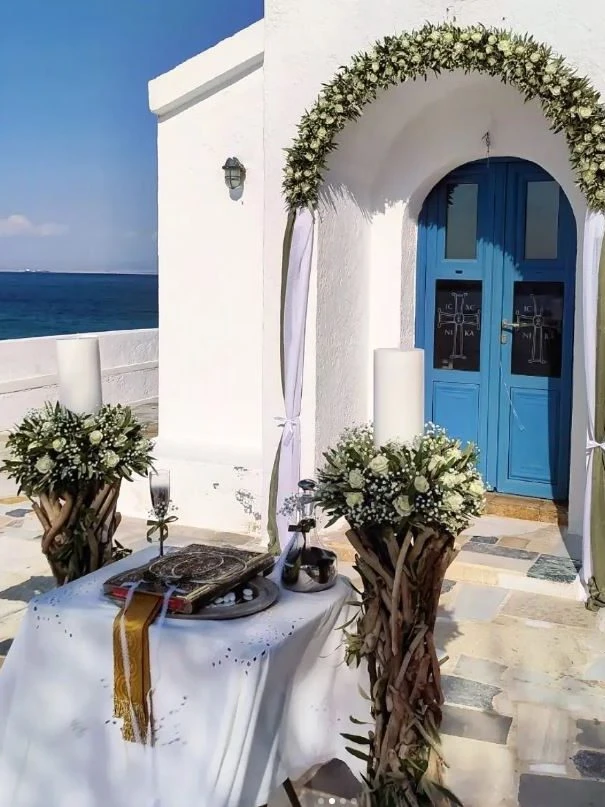 Είναι ένα από τα πιο όμορφα και γραφικά ξωκλήσια που με το “Φανάρι του Μπούζα” δεσπόζουν στην περιοχή δημιουργώντας μία μοναδική εικόνα δίπλα στη θάλασσα. Ο στολισμός που έχει επιλέξει το ζευγάρι είναι οι λευκές ορτανσίες και παιώνιες και αυτός θα είναι και ο στολισμός της δεξίωσης.