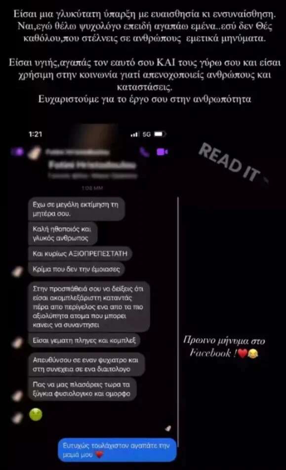 «Φωτεινή, είσαι μια γλυκύτατη ύπαρξη με ευαισθησία και ενσυναίσθηση. Ναι, εγώ θέλω ψυχολόγο, επειδή αγαπάω εμένα… εσύ δεν θες καθόλου που στέλνεις σε ανθρώπους εμετικά μηνύματα.