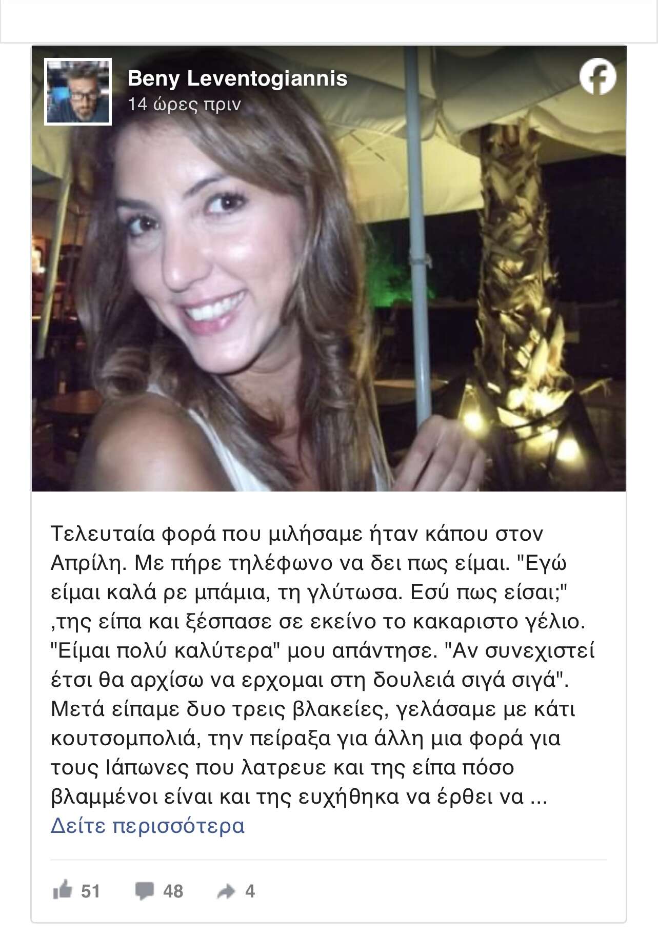 Ο δημοσιογράφος Beny Λεβεντογιάννης έγραψε: «Τελευταία φορά που μιλήσαμε ήταν κάπου στον Απρίλη. Με πήρε τηλέφωνο να δει πως είμαι. “Εγώ είμαι καλά ρε μπάμια, τη γλύτωσα. Εσύ πως είσαι;” ,της είπα και ξέσπασε σε εκείνο το κακαριστο γέλιο. “Είμαι πολύ καλύτερα” μου απάντησε. “Αν συνεχιστεί έτσι θα αρχίσω να ερχομαι στη δουλειά σιγά σιγά”. Μετά είπαμε δυο τρεις βλακείες, γελάσαμε με κάτι κουτσομπολιά, την πείραξα για άλλη μια φορά για τους Ιάπωνες που λατρευε και της είπα πόσο βλαμμένοι είναι και της ευχήθηκα να έρθει να δουλέψουμε μαζί ξανά. Κλείσαμε το τηλέφωνο. Είχα την σιγουρια ότι θα ερχόταν. Δεν τα κατάφερε. Δεν θα έρθει ποτέ ξανά, να καθίσει δίπλα μου και να με ρωτήσει “Τι θα γίνει; Θα ανοίξουμε καμιά φορά οδηγό;” Το Τινακι έφυγε. Ήταν ένα ξεχωριστό υπέροχο κορίτσι. Σπάνιο. Να προσέχετε όλοι τον εαυτό σας. Μην αφήνετε ούτε μια στιγμή να περάσει καλή ή κακή, χωρίς να τη ρουφηξετε.