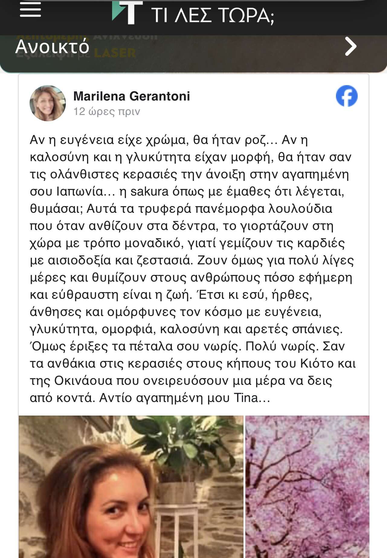 “Αν η ευγένεια είχε χρώμα, θα ήταν ροζ… Αν η καλοσύνη και η γλυκύτητα είχαν μορφή, θα ήταν σαν τις ολάνθιστες κερασιές την άνοιξη στην αγαπημένη σου Ιαπωνία… η sakura όπως με έμαθες ότι λέγεται, θυμάσαι; Αυτά τα τρυφερά πανέμορφα λουλούδια που όταν ανθίζουν στα δέντρα, το γιορτάζουν στη χώρα με τρόπο μοναδικό, γιατί γεμίζουν τις καρδιές με αισιοδοξία και ζεστασιά. Ζουν όμως για πολύ λίγες μέρες και θυμίζουν στους ανθρώπους πόσο εφήμερη και εύθραυστη είναι η ζωή. Έτσι κι εσύ, ήρθες, άνθησες και ομόρφυνες τον κόσμο με ευγένεια, γλυκύτητα, ομορφιά, καλοσύνη και αρετές σπάνιες. Όμως έριξες τα πέταλα σου νωρίς. Πολύ νωρίς. Σαν τα ανθάκια στις κερασιές στους κήπους του Κιότο και της Οκινάουα που ονειρευόσουν μια μέρα να δεις από κοντά. Αντίο αγαπημένη μου Τίνα” έγραψε χαρακτηριστικά η Μαριλένα Γεραντώνη.