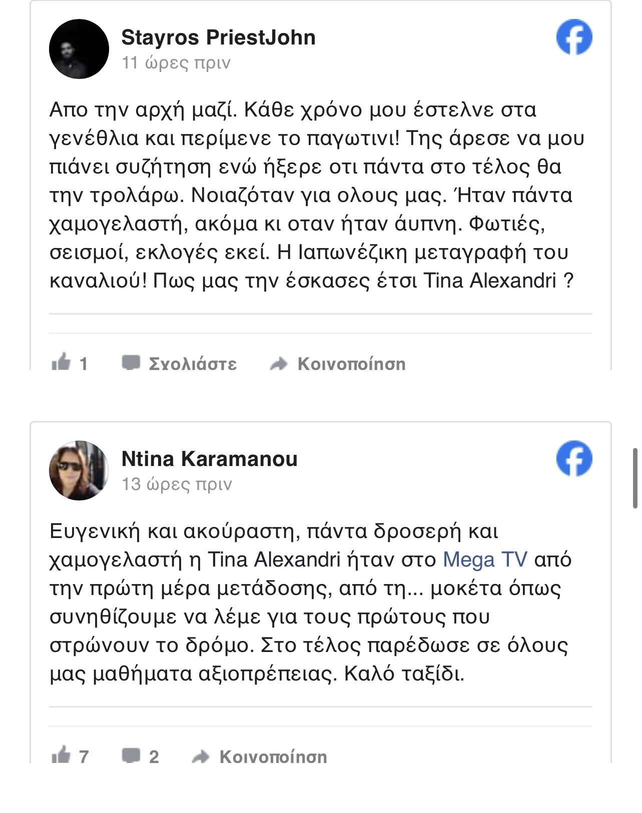 Την ίδια στιγμή, συνάδελφοί της, αποχαιρετούν την Τίνα Αλεξανδρή με αναρτήσεις στα social media.