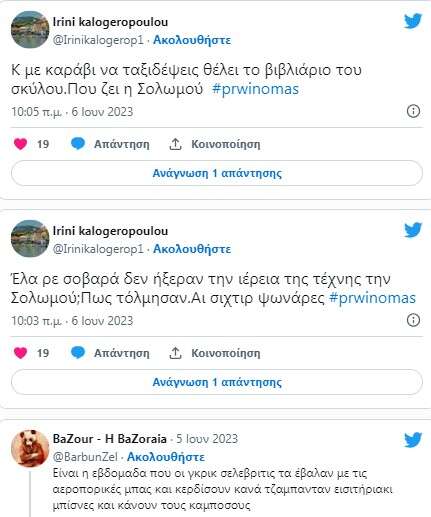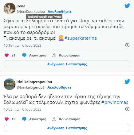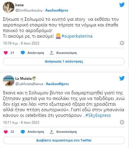 «Έλα ρε σοβαρά δεν την ήξεραν την Σολωμού; Πώς τόλμησαν;», «Άντε με όλες τις ψωνάρες που θέλουν να εξυπηρετούνται κατά προτεραιότητα. Είναι κανόνες ασφαλείας που ισχύουν ΓΙΑ ΟΛΟΥΣ τους επιβάτες Και οι διάσημοι απειλούν με στορι τις εταιρείες; Αυτό μας είπε τώρα η Σολωμού», γράφουν μερικοί χρήστες.