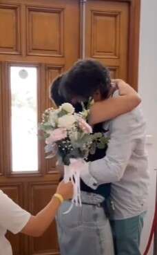 Το ζευγάρι αγκαλιάζεται σφιχτά και εκείνη προχωρά να χαιρετήσει τα αγαπημένα της πρόσωπα με ένα λαμπερό χαμόγελο.