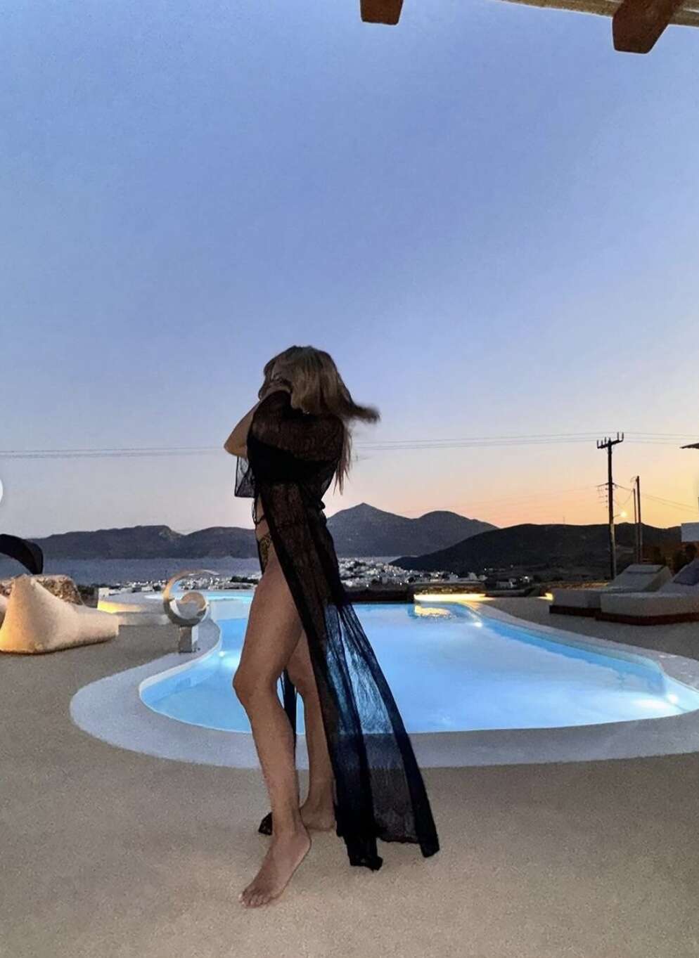 Η γνωστή γυμνάστρια μοιράστηκε στον προσωπικό της λογαριασμό στο Instagram φωτογραφίες από το ταξίδι της στις Κυκλάδες. Σε μια από αυτές, ποζάρει δίπλα στην πισίνα, φορώντας ένα μπικίνι με leopard μοτίβο που αναδεικνύει τη γυμνασμένη και καλλίγραμμη σιλουέτα της, συνδυασμένο με ένα μαύρο κιμονό.