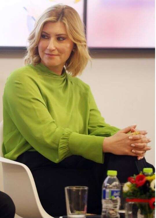 Η ίδια παρουσίασε το βιβλίο της στο κτίριο της ΕΣΗΕΑ φορώντας ένα λαχανί τοπ με κλειστό λαιμό, μαύρο παντελόνι και κίτρινες γόβες.