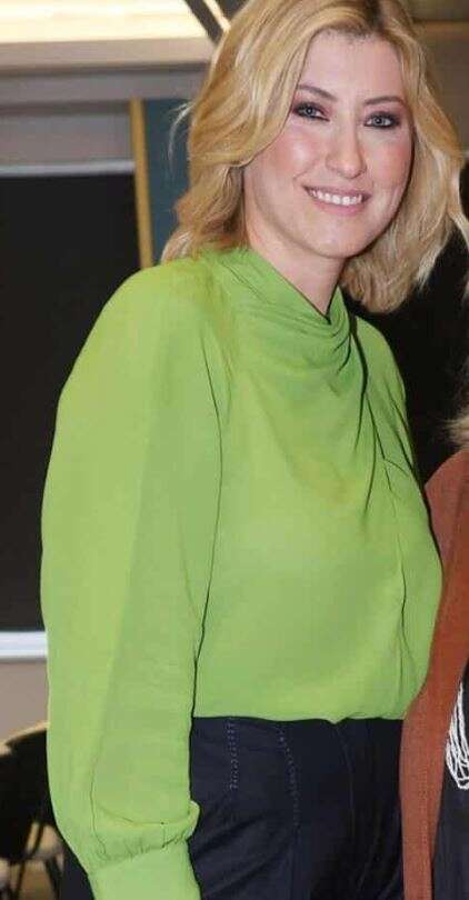 Η ίδια παρουσίασε το βιβλίο της στο κτίριο της ΕΣΗΕΑ φορώντας ένα λαχανί τοπ με κλειστό λαιμό, μαύρο παντελόνι και κίτρινες γόβες.