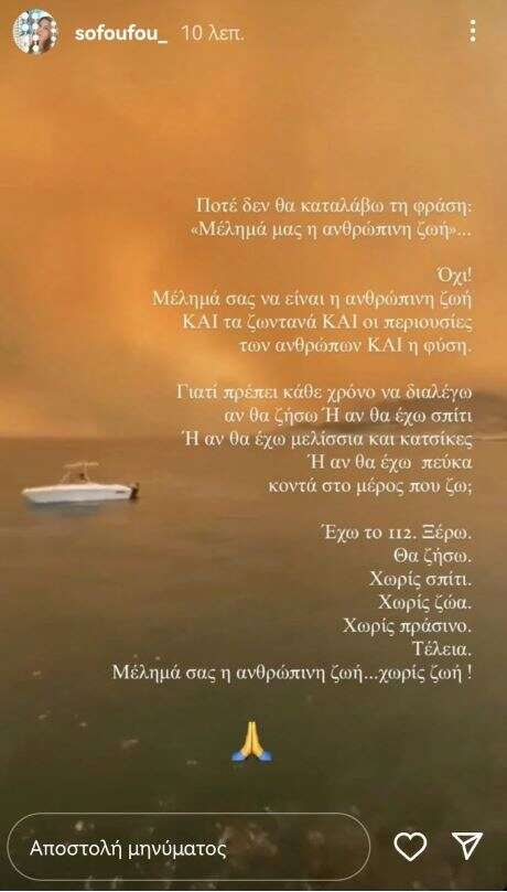 Με μια ανάρτηση στον προσωπικό της λογαριασμό στο Instagram, η γνωστή ηθοποιός και παρουσιάστρια Σοφία Αλιμπέρτη, σχολίασε τα γεγονότα των μεγάλων πυρκαγιών που δοκιμάζουν τη χώρα το τελευταίο διάστημα.