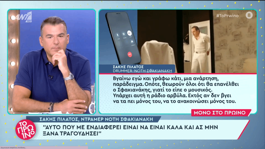 Ο Σάκης Πιλάτος, στενός συνεργάτης του Νότη Σφακιανάκη και ντράμερ του τραγουδιστή, μίλησε στην εκπομπή Πρωινό και αποκάλυψε τι κάνει και που βρίσκεται σήμερα ο τραγουδιστής. Επιπλέον τόνισε πως ο τραγουδιστής είναι καλά και ίσως χάθηκε από το προσκήνιο γιατί ντράπηκε και στεναχωρήθηκε από κάποιους ανθρώπους.