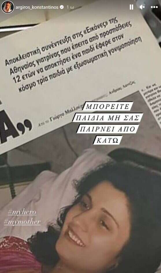 Στη μια φωτογραφία ο Κωνσταντίνος Αργυρός έγραψε «Μπορείτε παιδιά μη σας παίρνει από κάτω» ενώ πιο κάτω ανέφερε «Ο ήρωας μου, η μητέρα μου».