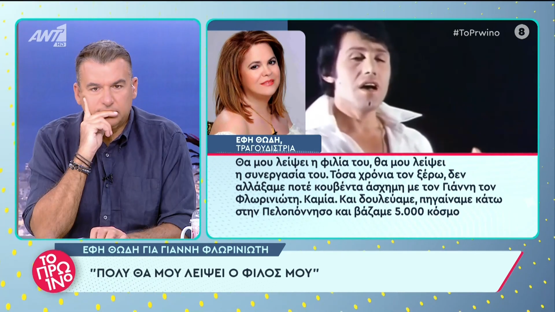 Η Έφη Θώδη εμφανίστηκε συγκινημένη στο Πρωινό μετά από τον χαμό του φίλου της, Γιάννη Φλωρινιώτη. Μάλιστα οι δύο τραγουδιστές είχαν εμφανιστεί πολλές φορές μαζί σε πανηγύρια.