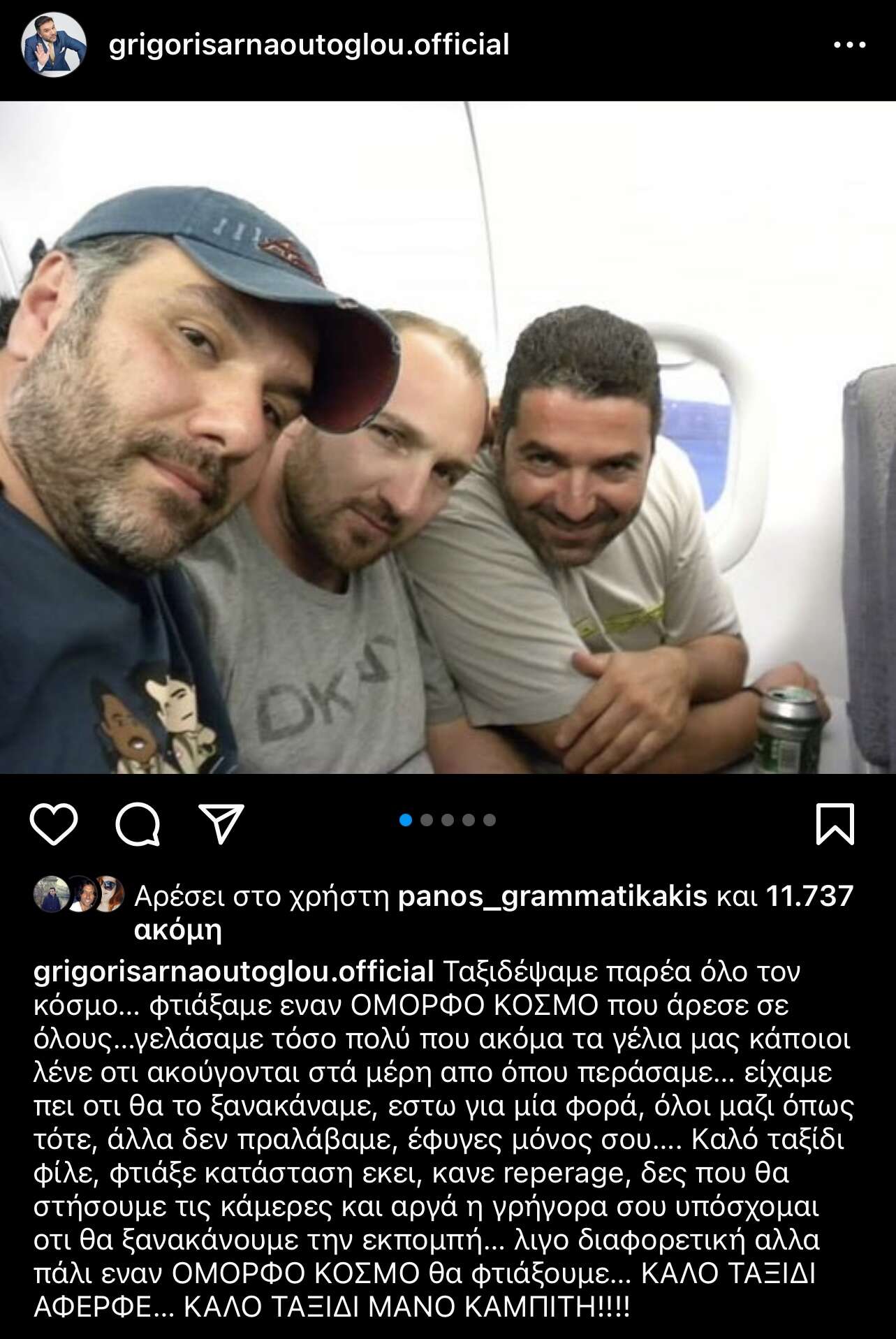 «Ταξιδέψαμε παρέα όλο τον κόσμο… φτιάξαμε έναν ΟΜΟΡΦΟ ΚΟΣΜΟ που άρεσε σε όλους…γελάσαμε τόσο πολύ που ακόμα τα γέλια μας κάποιοι λένε οτι ακούγονται στά μέρη από όπου περάσαμε… είχαμε πει οτι θα το ξανακάναμε, εστω για μία φορά, όλοι μαζι όπως τότε, άλλα δεν πραλάβαμε, έφυγες μόνος σου…. Καλό ταξίδι φίλε, φτιάξε κατάσταση εκεί, κάνε reperage, δες που θα στήσουμε τις κάμερες και αργά η γρήγορα σου υπόσχομαι οτι θα ξανακάνουμε την εκπομπή… λιγο διαφορετική αλλά πάλι έναν ΟΜΟΡΦΟ ΚΟΣΜΟ θα φτιάξουμε… ΚΑΛΟ ΤΑΞΙΔΙ ΑΦΕΡΦΕ… ΚΑΛΟ ΤΑΞΙΔΙ ΜΑΝΟ ΚΑΜΠΙΤΗ!!!!» έγραψε στη λεζάντα της ανάρτησής του ο Γρηγόρης Αρναούτογλου.