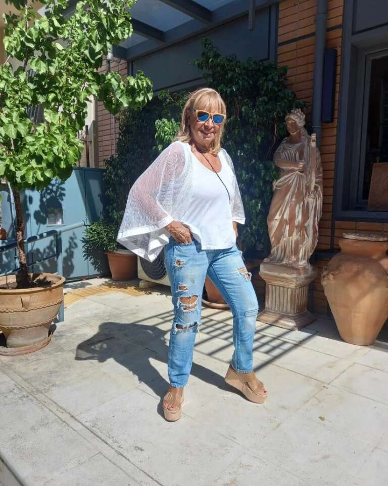 Η ηθοποιός πόζαρε φορώντας σκισμένο τζιν, με λευκό μπλουζάκι και μπεζ πλατφόρμες στην αυλή του “Σπιτιού του ηθοποιού” και δημοσίευσε της φωτογραφίες στο Instagram.