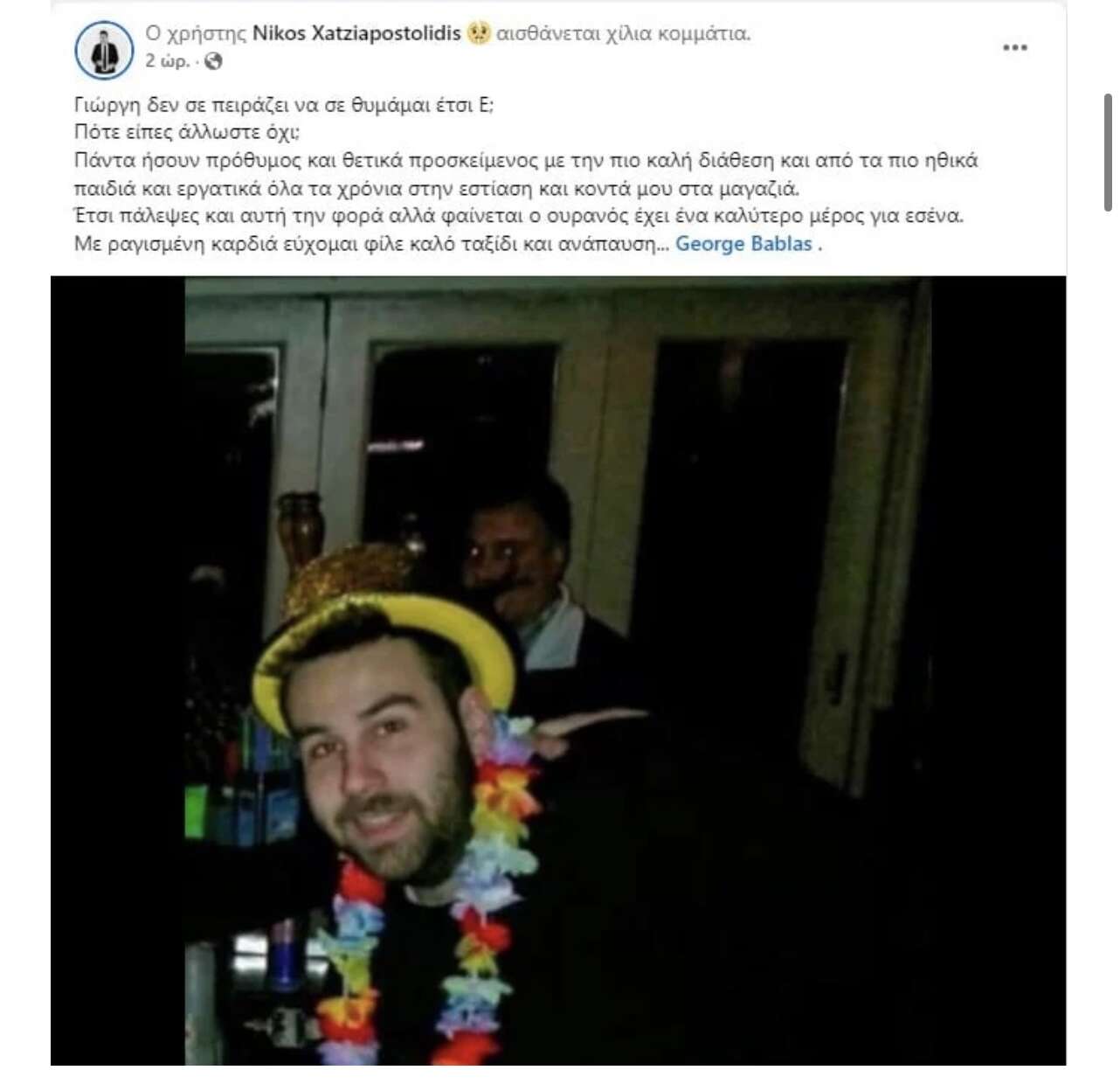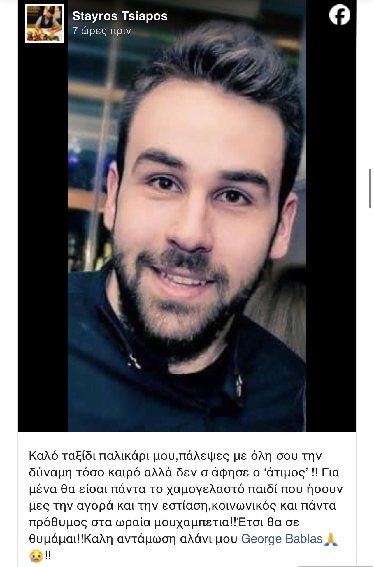 “Καλό ταξίδι παλικάρι μου, πάλεψες με όλη σου την δύναμη τόσο καιρό αλλά δεν σ άφησε ο ‘άτιμος’ !! Για μένα θα είσαι πάντα το χαμογελαστό παιδί που ήσουν μες την αγορά και την εστίαση,κοινωνικός και πάντα πρόθυμος στα ωραία μουχαμπετια!!Έτσι θα σε θυμάμαι!!Καλη αντάμωση αλάνι μου George Bablas”, ο Stayros Tsiapos