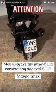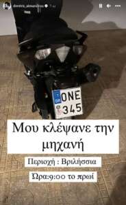 Με story που ανέβασε ο ίδιος στο Instagram, δείχνει το μηχανάκι του και τις πινακίδες του και γράφει σε ποια περιοχή κλάπηκε το όχημά του και ποια ώρα.