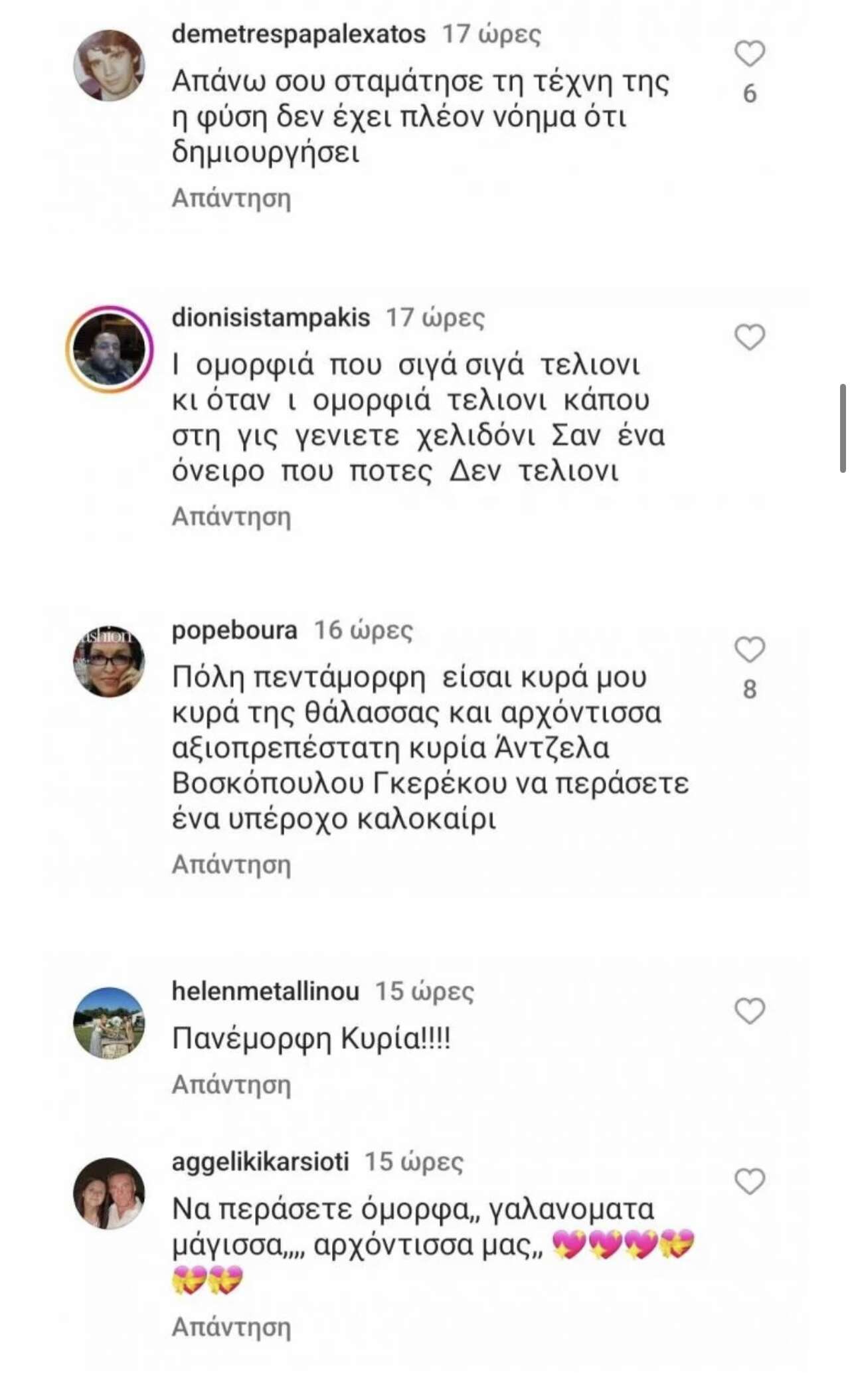 Η πρόσφατη ανάρτηση, λοιπόν της Άντζελας Γκερέκου συγκέντρωσε όχι μόνο πολλά likes από τους followers της αλλά και κάποια πιο ιδιαίτερα σχόλια, τα οποία θα έλεγε κανείς πως θα μπορούσαν να σταθούν άνετα σαν μικρά ποιήματα.