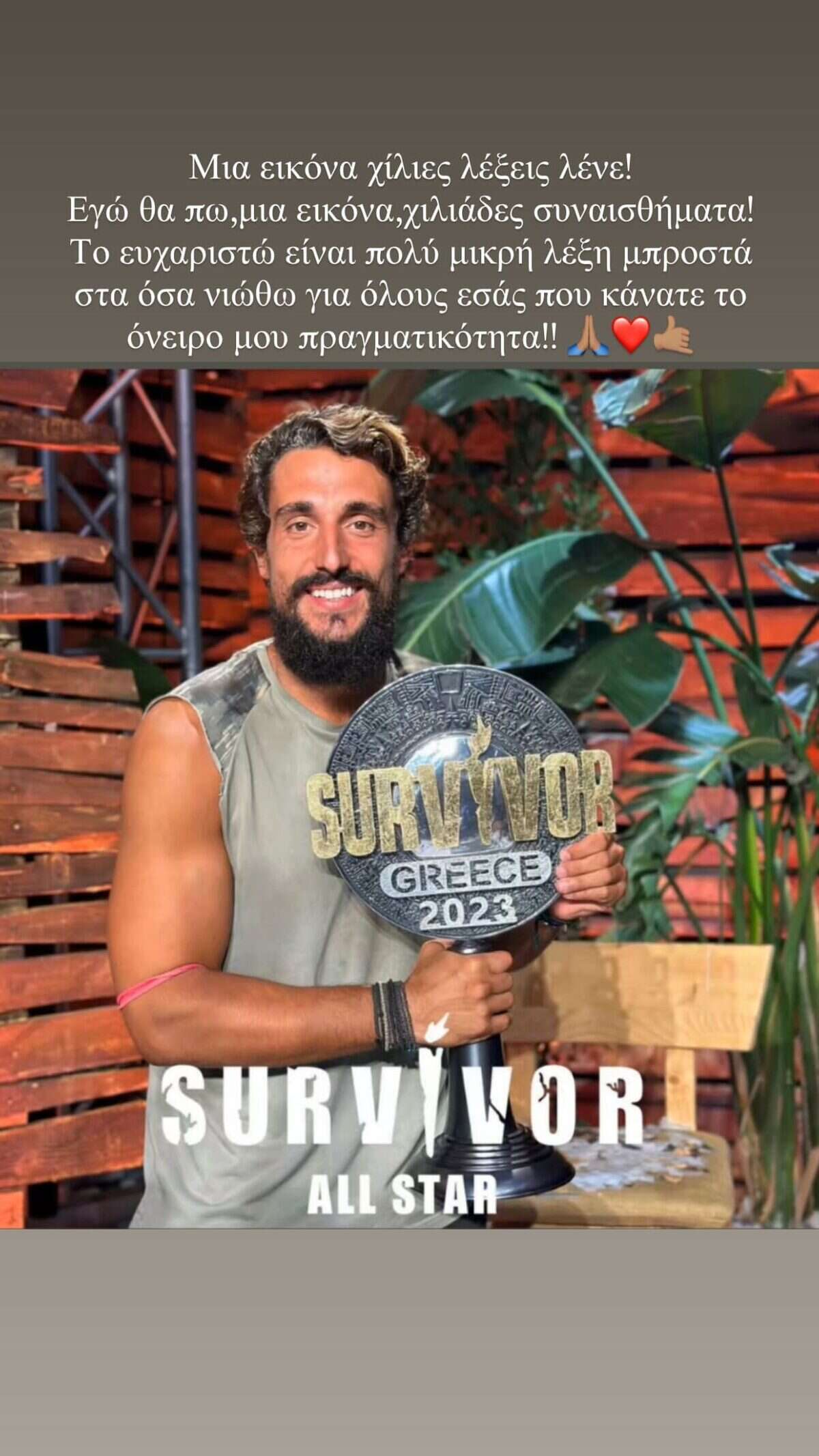Λίγες ώρες μετά το τέλος του «Survivor All Star», ο Σάκης έκανε τη δική του ανάρτηση γράφοντας: «Μία εικόνα χίλιες λέξεις λένε. Εγώ θα πω μία εικόνα, χιλιάδες συναισθήματα. Το ευχαριστώ είναι μικρή λέξη μπροστά στα όσα νιώθω για όλους εσάς που κάνατε το όνειρό μου πραγματικότητα».