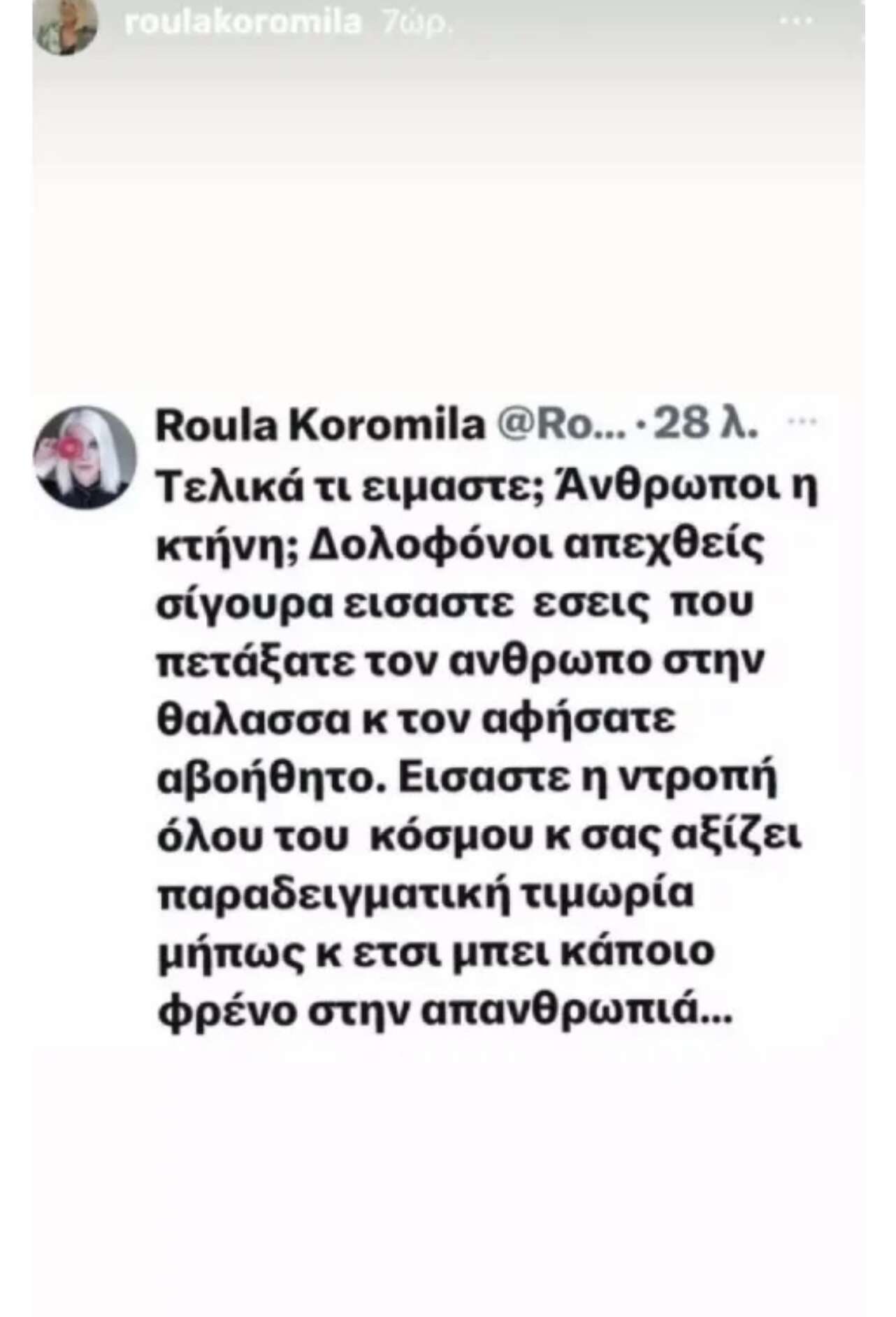 «Τελικά τι είμαστε; Άνθρωποι ή κτήνη; Δολοφόνοι απεχθείς σίγουρα είσαστε εσείς που πετάξατε τον άνθρωπο στην θάλασσα και τον αφήσατε αβοήθητο. Είσαστε η ντροπή όλου το κόσμου και σας αξίζει παραδειγματική τιμωρία μήπως και έτσι μπει κάποιο φρένο στην απανθρωπιά» έγραψε η παρουσιάστρια, απευθυνόμενη σε όσους ευθύνονται για τον θάνατο του άτυχου άνδρα.