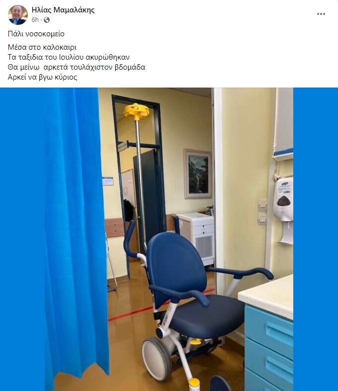 «Πάλι νοσοκομείο. Μέσα στο καλοκαίρι. Τα ταξίδια του Ιουλίου ακυρώθηκαν, θα μείνω αρκετά, τουλάχιστον βδομάδα. Αρκεί να βγω κύριος», έγραψε ο Ηλίας Μαμαλάκης στη λεζάντα της δημοσίευσης και κοινοποίησε μία φωτογραφία του, μέσα από το νοσοκομείο.