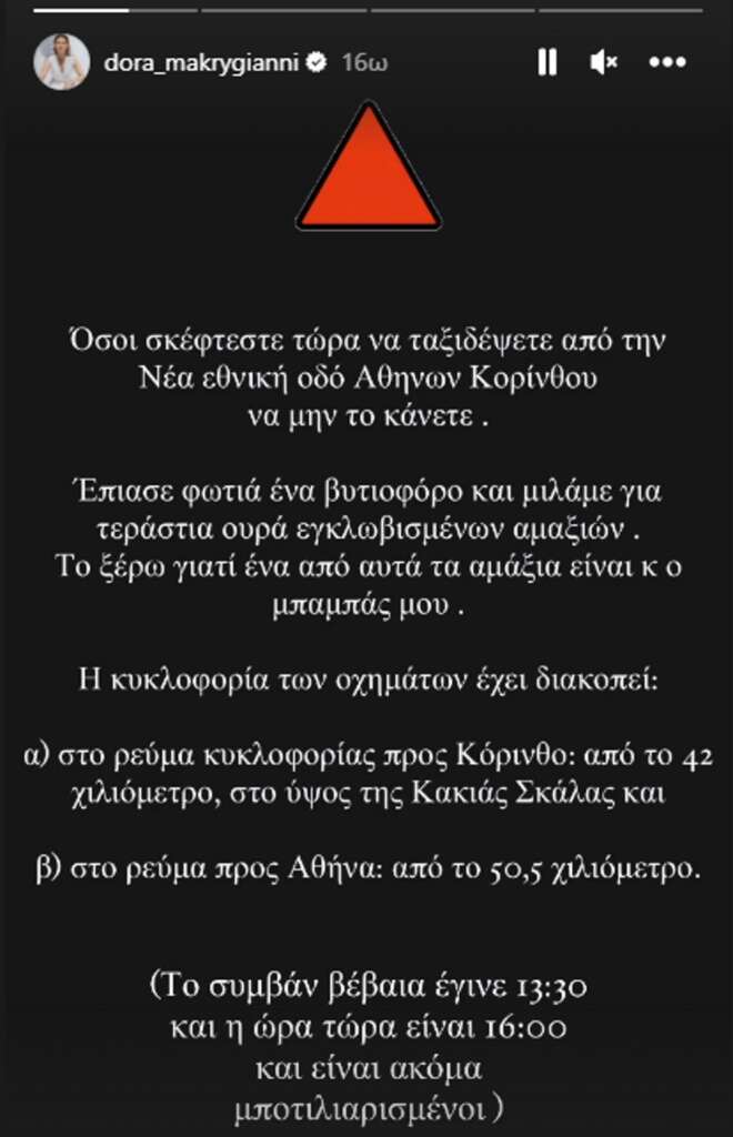 Και η ηθοποιός Ντόρα Μακρυγιάννη για την ταλαιπωρία στην Εθνική Οδό