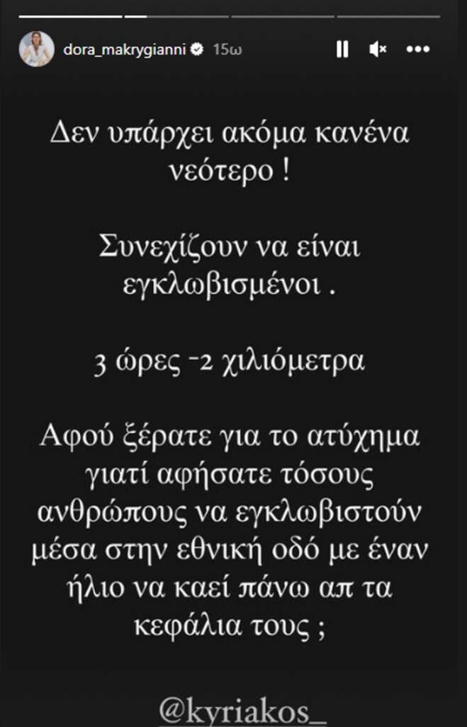 Μηνύματα αγανάκτησης για την ταλαιπωρία των οδηγών μοιράστηκε και η ηθοποιός Ντόρα Μακρυγιάννη, με τον πατέρα της να βρίσκεται ανάμεσα σε όσους εγκλωβίστηκαν.