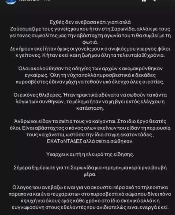 «Σήμερα ξημέρωσε για τη Σαρωνίδα μία «ήρεμη», μία περίεργα βουβή μέρα. Ο λόγος που ανεβάζω είναι για να ακουστεί πέρα από τα τηλεοπτικά παράπονα και ένα «ευχαριστώ» στο Πυροσβεστικό Σώμα που δίνει πόνο και ψυχή για όλους εμάς κάθε χρόνο στο ίδιο σκηνικό αλλά και η ευγνωμοσύνη στους εθελοντές, που ανιδιοτελώς είναι ενεργά εκεί», καταλήγει στην ανάρτησή της η Ελεονώρα Μελέτη.