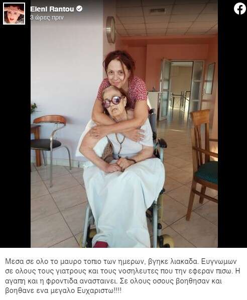 «Μέσα σε όλο αυτό το μαύρο τοπίο των ημερών, βγήκε η λιακάδα. Ευγνώμων σε όλους τους γιατρούς και τους νοσηλευτές που την έφεραν πίσω. Η αγάπη και η φροντίδα ανασταίνει. Σε όλους όσους βοήθησαν και βοηθάνε, ένα μεγάλο ευχαριστώ», έγραψε η Ελ. Ράντου.
