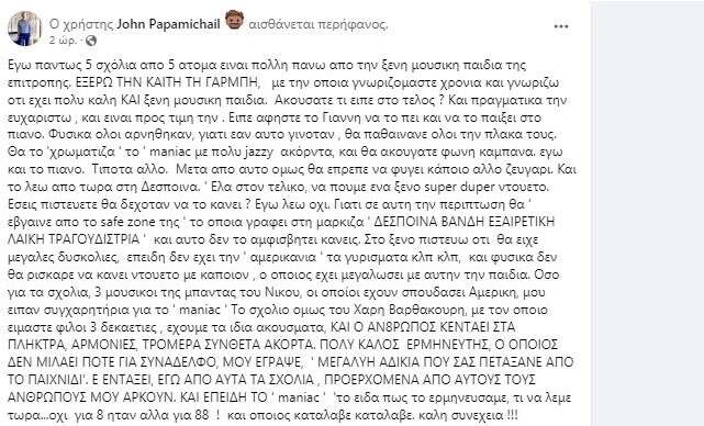 Συγκεκριμένα έγραψε: «Εγώ πάντως 5 σχόλια από 5 άτομα είναι πολύ πάνω από την ξένη μουσική παιδεία της επιτροπής. ΕΞΑΙΡΩ ΤΗΝ ΚΑΙΤΗ ΤΗ ΓΑΡΜΠΗ, με την οποία γνωριζόμαστε χρόνια και γνωρίζω ότι έχει πολύ καλή ΚΑΙ ξένη μουσική παιδεία. Ακούσατε τι είπε στο τέλος? Και πραγματικά την ευχαριστώ και είναι προς τιμή της. Είπε αφήστε το Γιάννη να το πει και να το παίξει στο πιάνο. Φυσικά όλοι αρνήθηκαν, γιατί εάν αυτό γινόταν, θα παθαίνανε όλοι την πλάκα τους. Θα το ‘χρωμάτιζα ‘ το ‘ maniac με πολύ jazzy ακόρντα, και θα ακούγατε φωνή καμπάνα. Εγώ και το πιάνο. Τίποτα άλλο. Μετά από αυτό όμως θα έπρεπε να φύγει κάποιο άλλο ζευγάρι. Και το λέω από τώρα στη Δέσποινα. Έλα στον τελικό, να πούμε ένα ξένο super duper ντουέτο. Εσείς πιστεύετε θα δεχόταν να το κάνει? Εγώ λέω όχι. Γιατί σε αυτή την περίπτωση θα έβγαινε από το safe zone της το οποία γράφει στη μαρκίζα ”ΔΕΣΠΟΙΝΑ ΒΑΝΔΗ ΕΞΑΙΡΕΤΙΚΗ ΛΑΙΚΗ ΤΡΑΓΟΥΔΙΣΤΡΙΑ” και αυτό δεν το αμφισβητεί κανείς.