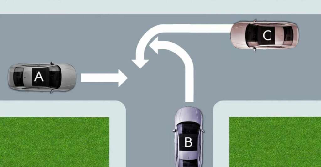 Σε ενδεχόμενη λοιπόν διασταύρωση «Τ» τριών αυτοκινήτων όπου δεν υπάρχουν πινακίδες ή φανάρια, κανένας από τους δύο δρόμους δεν είναι κύριος και κάθε ένα από τα αυτοκίνητα θέλει να ακολουθήσει την πορεία που υποδεικνύουν τα βέλη, η απάντηση είναι «B-A-C».
