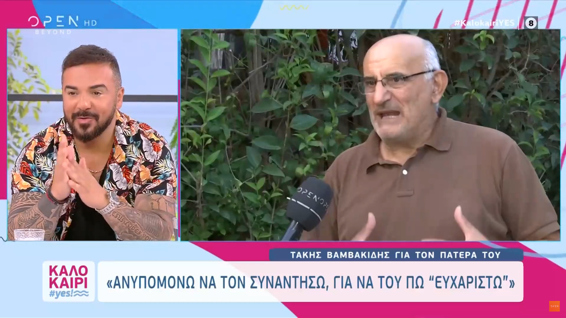 «Περιμένω, έχω αγωνία πότε θα τον συναντήσω να του πω τη λέξη που το χρωστάω… “Ευχαριστώ πατέρα μου, άγιε άνθρωπε του πλανήτη. Αντάρτη μου αθάνατε”», είπε στην κάμερα της εκπομπής «Καλοκαίρι Yes» ο Τάκης Βαμβακίδης ξεσπώντας σε κλάματα για τον πατέρα του ο οποίος δεν βρίσκεται πλέον στη ζωή.