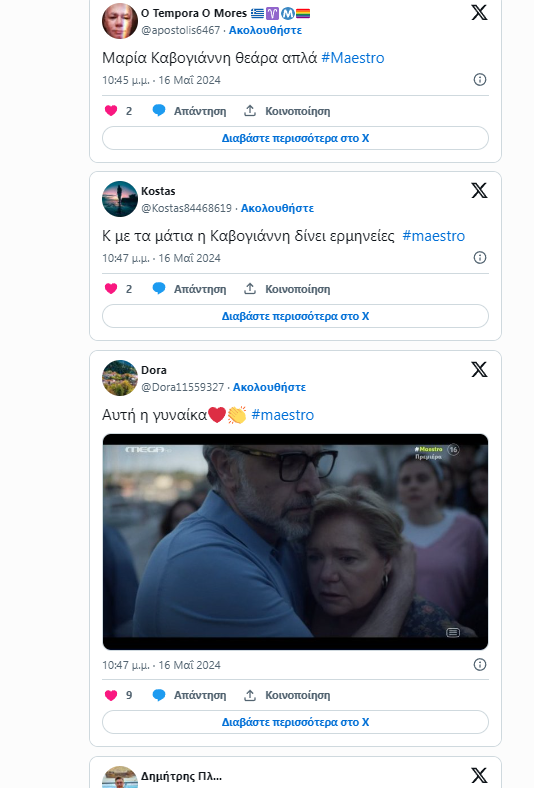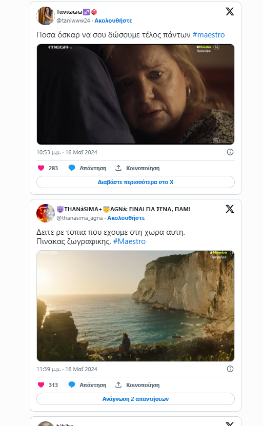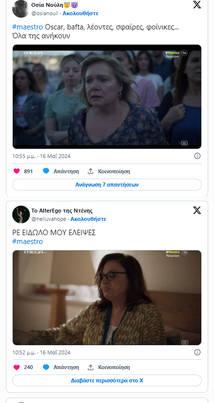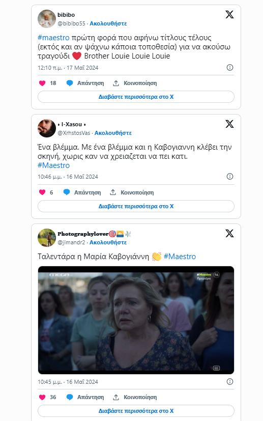 Με φωτογραφίες των τριών γυναικών από σκηνές τους στο Maestro, το Twitter τις αποθέωσε, ενώ θετικά σχόλια απέσπασαν η πλοκή της ιστορίας, η σκηνοθεσία και η μουσική επιμέλεια της σειράς.