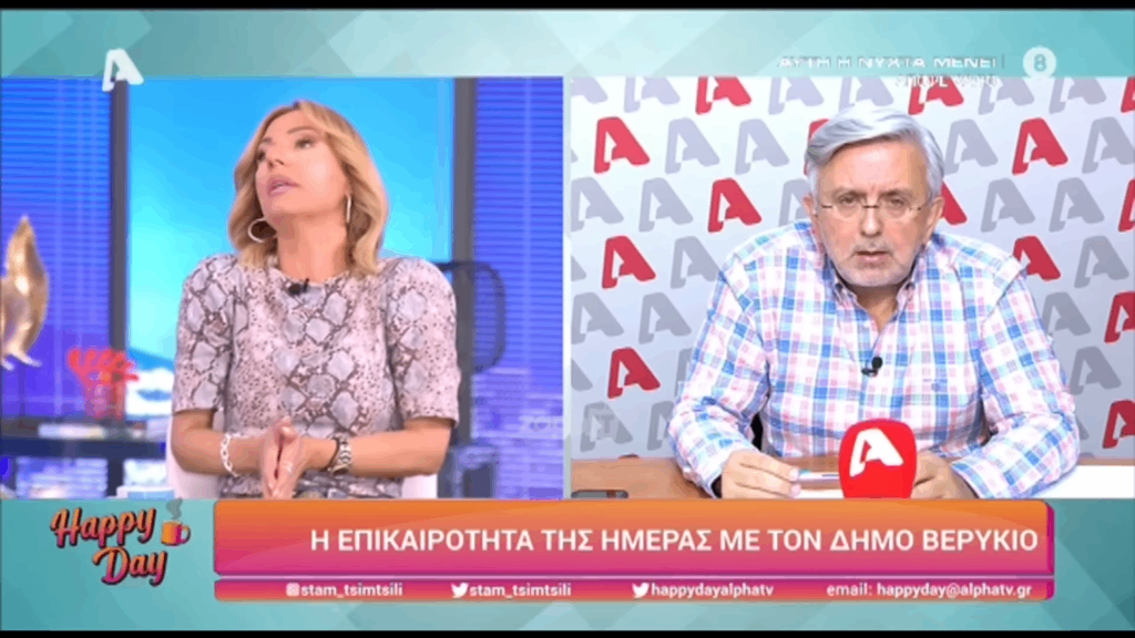 Μια άνευ προηγουμένου ένταση προκλήθηκε στο πλατό της εκπομπής «Happy Day» με αφορμή την πολιτική κουβέντα που έκανε ο Δήμος Βερύκιος. Ειδικότερα, ο κακός χαμός επικράτησε ανάμεσα στον Δημήτρη Παπανώτα και τη Τίνα Μεσσαροπούλου ενώ η ένταση είχε εκλογικό χαρακτήρα όπως φαίνεται από τον έντονο διάλογο που αντάλλαξαν οι δύο δημοσιογράφοι.