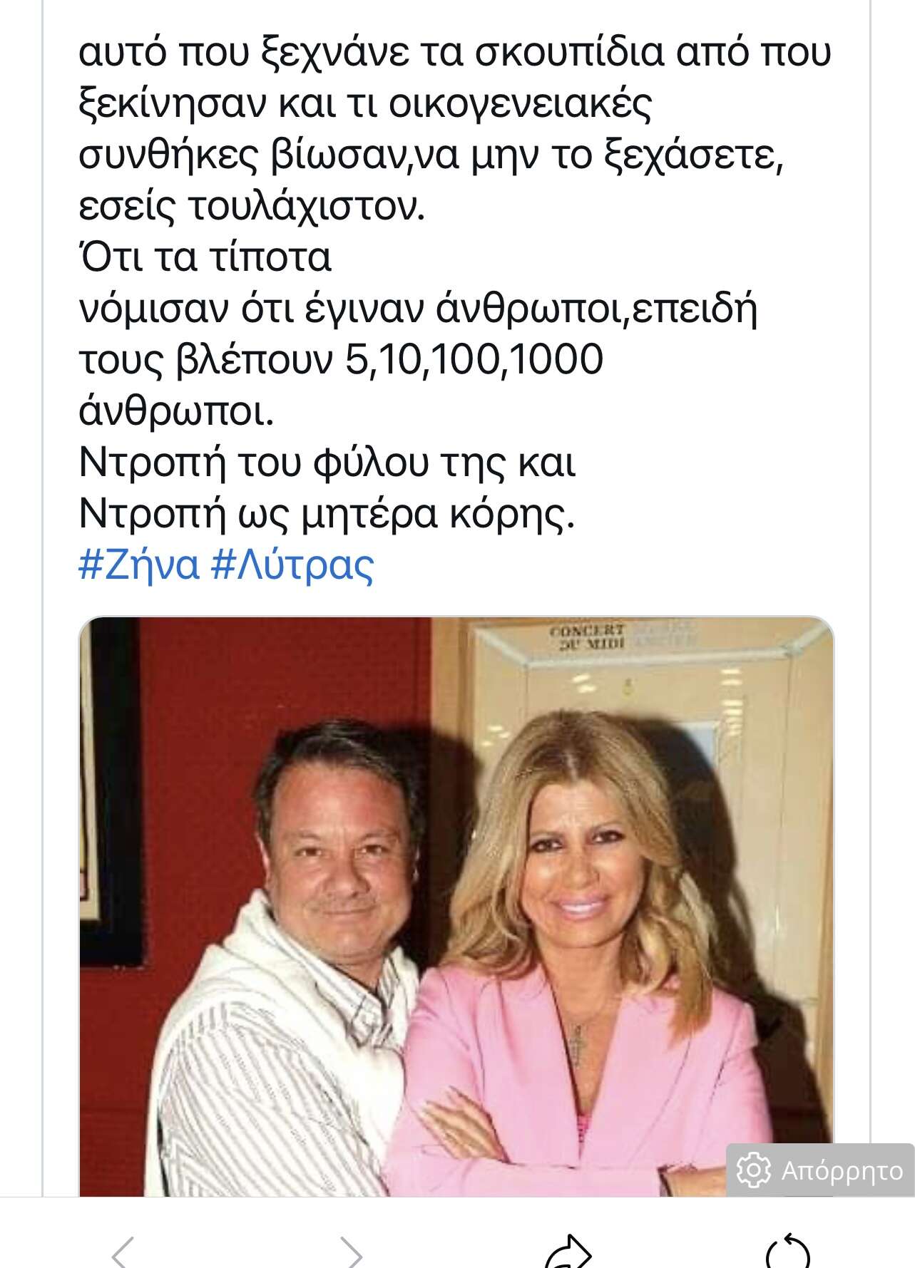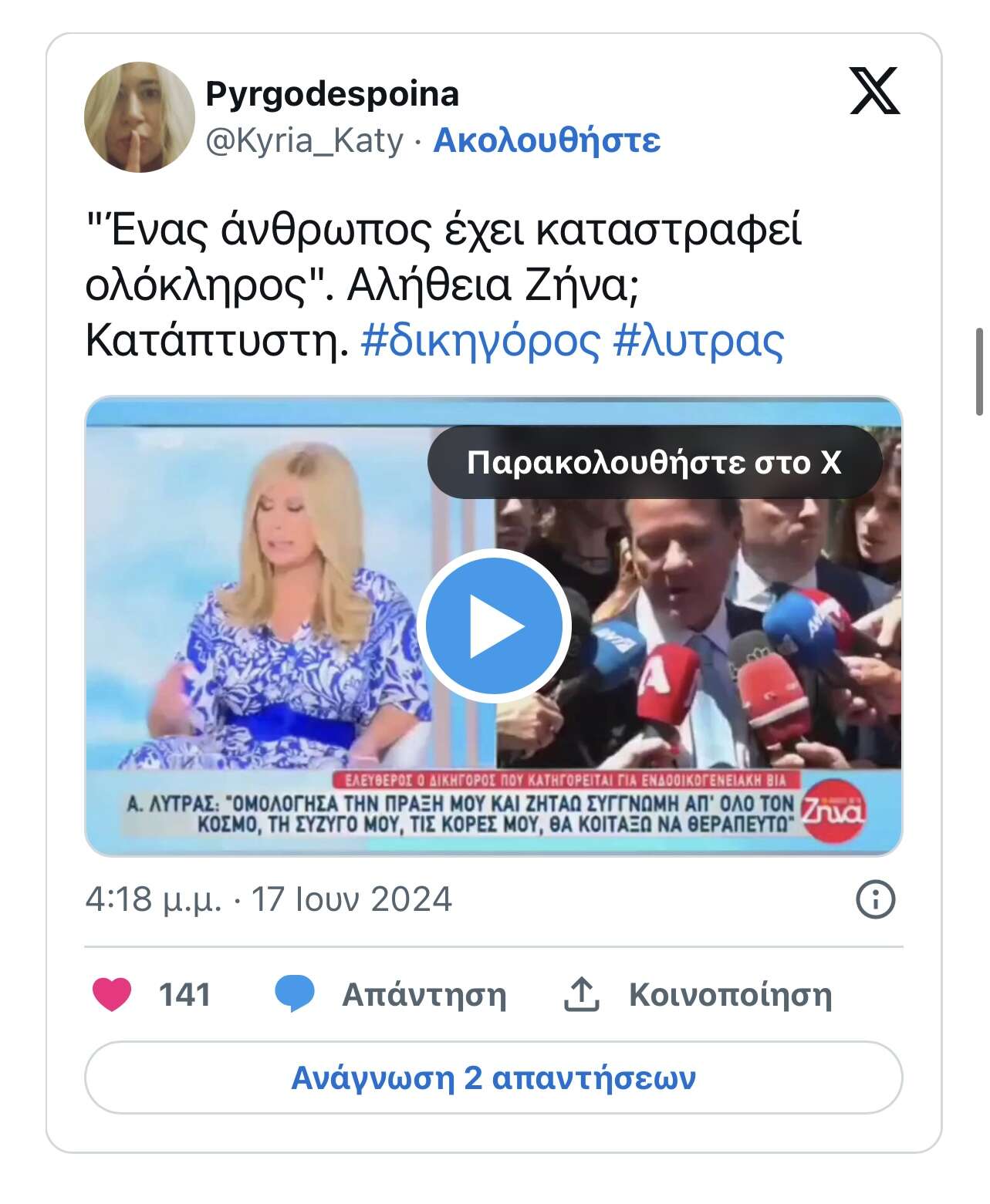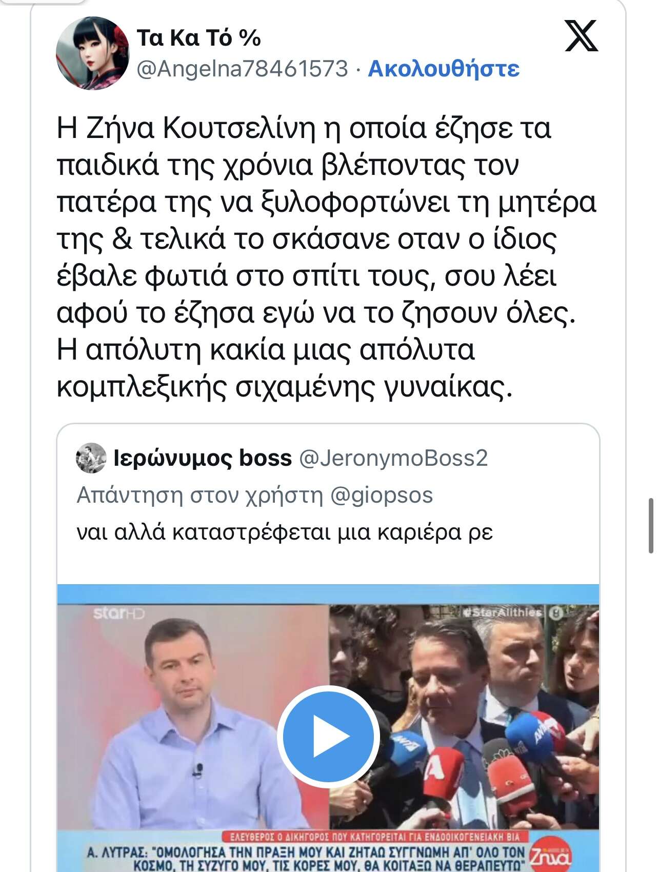 Τις περίεργες δηλώσεις της Ζήνας Κουτσελίνη υπέρ του Απόστολου Λύτρα, ο οποίος ξυλοκόπησε βάναυσα τη σύζυγό του, καταδίκασε το Twitter το μεσημέρι της Δευτέρας (17/6).