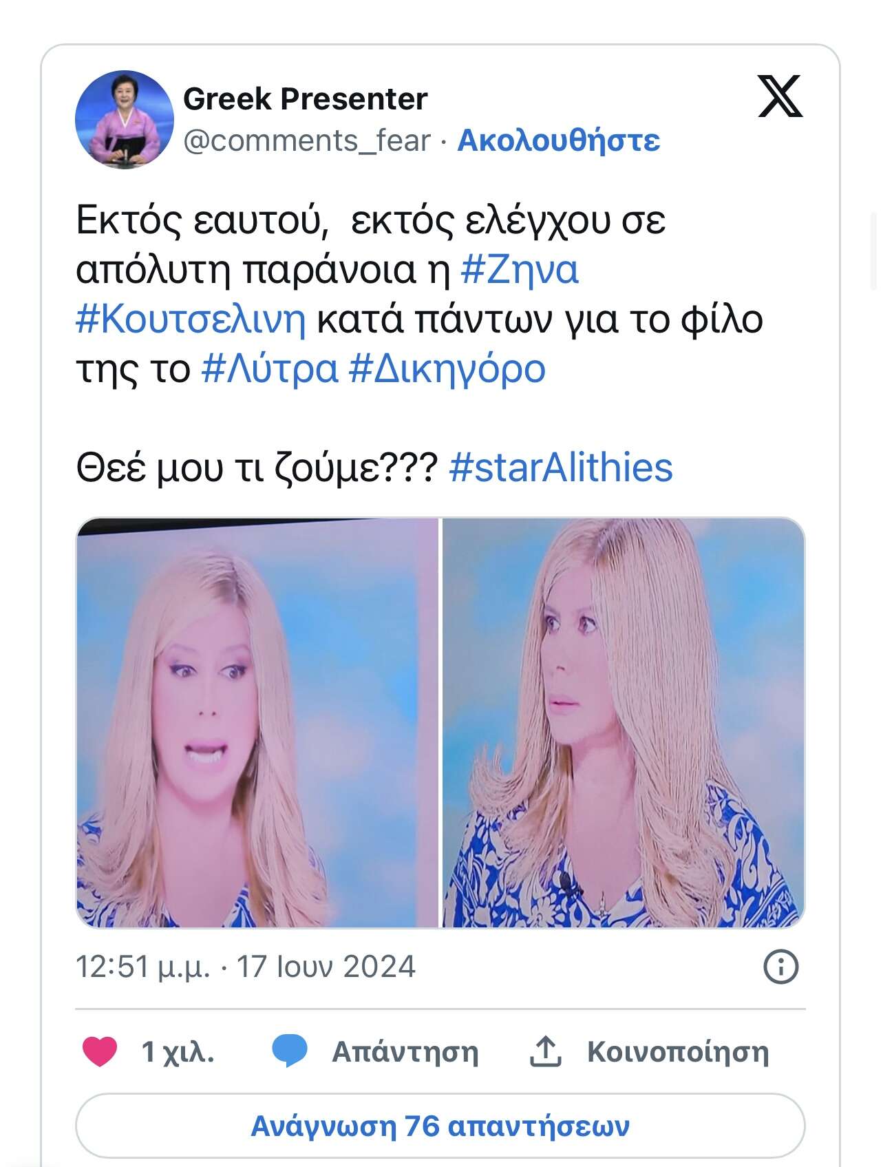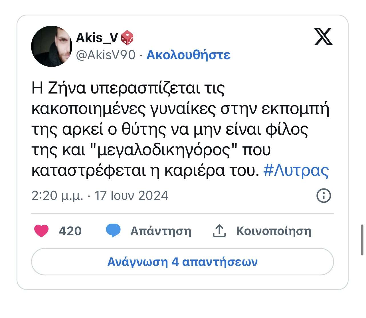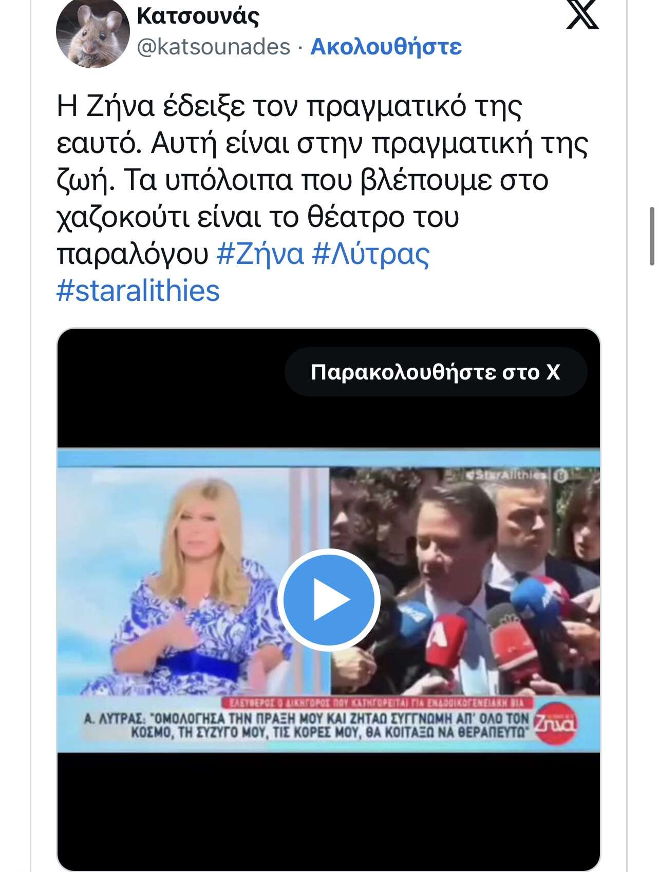 Τις περίεργες δηλώσεις της Ζήνας Κουτσελίνη υπέρ του Απόστολου Λύτρα, ο οποίος ξυλοκόπησε βάναυσα τη σύζυγό του, καταδίκασε το Twitter το μεσημέρι της Δευτέρας (17/6).