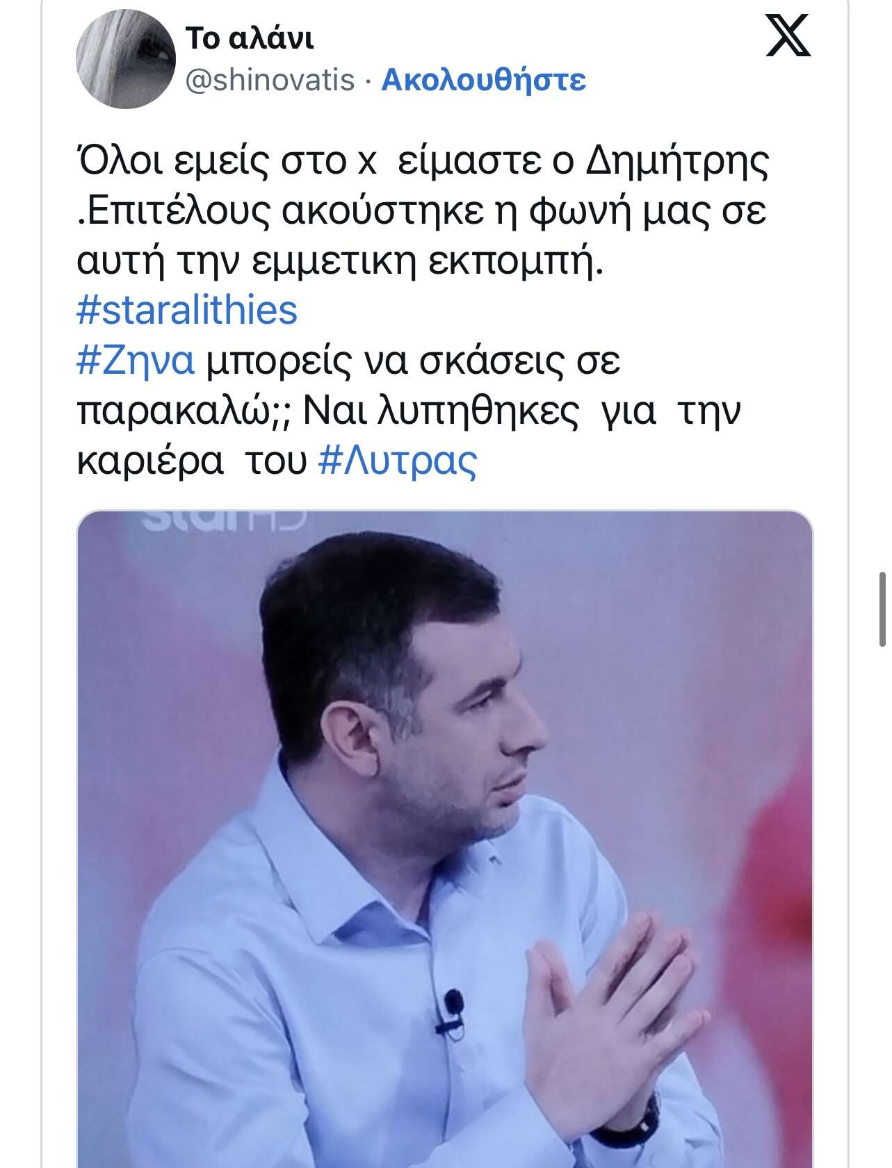 «Όλοι εμείς στο X είμαστε ο Δημήτρης, Επιτέλους ακούστηκε η εκπομπή μας σε αυτή την εμετική εκπομπή», έγραψε χαρακτηριστικά ένας χρήστης του δημοφιλούς μέσου κοινωνικής δικτύωσης.