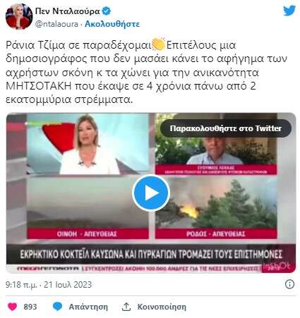 “Ακούμε ξανά και ξανά τη μόνιμη επωδό “πάνω από όλα η ανθρώπινη ζωή”, η αξία της οποίας φυσικά δεν αποτιμάται. Αναρωτιέμαι όμως, σε αυτή τη χώρα είμαστε καταδικασμένοι να βλέπουμε κάθε καλοκαίρι 40-50-60-100 σπίτια να καίγονται;” ήταν το σχόλιο της δημοσιογράφου.