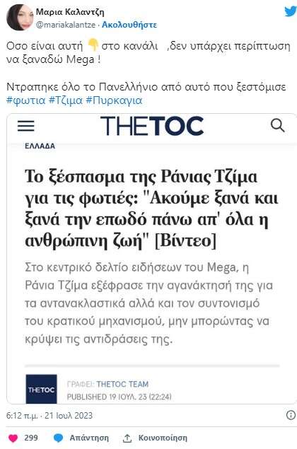 Θύελλα αντιδράσεων έχει προκληθεί από ένα σχόλιο που έκανε η Ράνια Τζίμα στον αέρα του κεντρικού δελτίου ειδήσεων του Mega. Καθώς παρακολουθούσαν την εξέλιξη των πυρκαγιών η παρουσιάστρια και δημοσιογράφος, βγήκε εκτός εαυτού με τις δηλώσεις των κυβερνητικών, “πάνω απ΄όλα είναι η ανθρώπινη ζωή”.