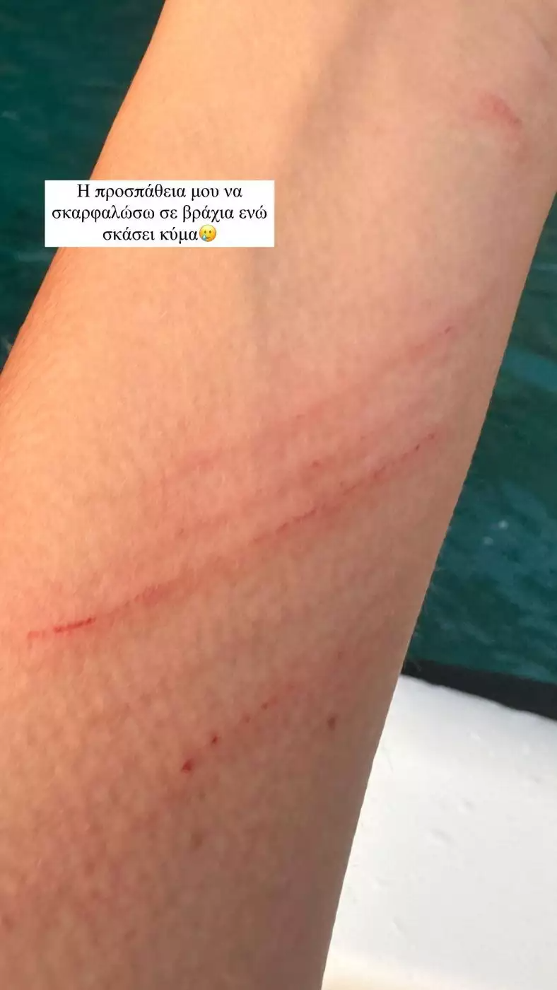 Η σύντροφος του Δημήτρη Αλεξάνδρου έδειξε στον προσωπικό της λογαριασμό στο Instagram τις γρατζουνιές που απέκτησε στην κοιλιά και στο χέρι της, όταν προσπάθησε να ανέβει σε βράχια από την θάλασσα και την παρέσυραν τα κύματα.