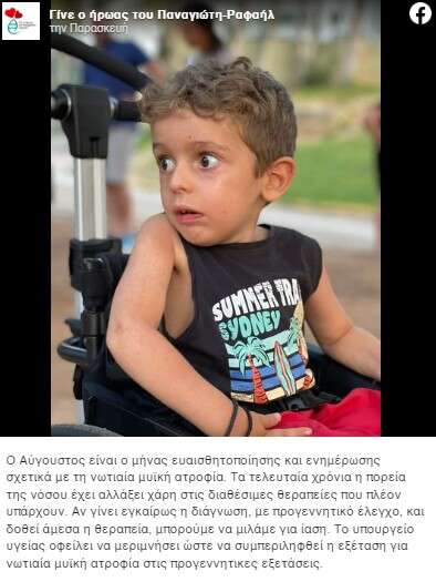 Όπως αναφέρεται στη σελίδα στο Facebook “Γίνε ο ήρωας του Παναγιώτη- Ραφαήλ”, ο Αύγουστος είναι ο μήνας ευαισθητοποίησης και ενημέρωσης σχετικά με τη νωτιαία μυϊκή ατροφία.