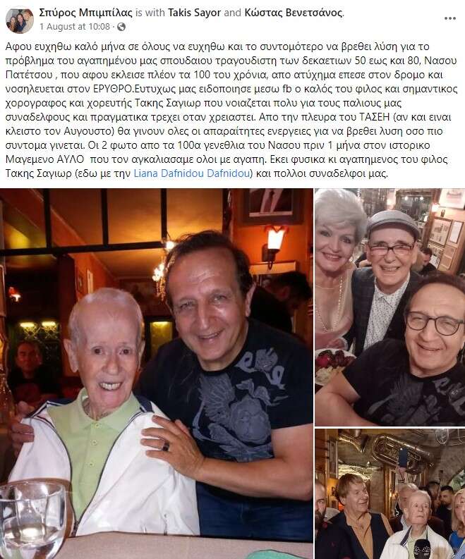 «Ο μεγάλος μας τραγουδιστής που έκανε τεράστια καριέρα τις δεκαετίες 50-60-70 Νάσος Πατέτσος βρίσκεται στο νοσοκομείο, μετά από πτώση του σε πεζοδρόμιο!!!!