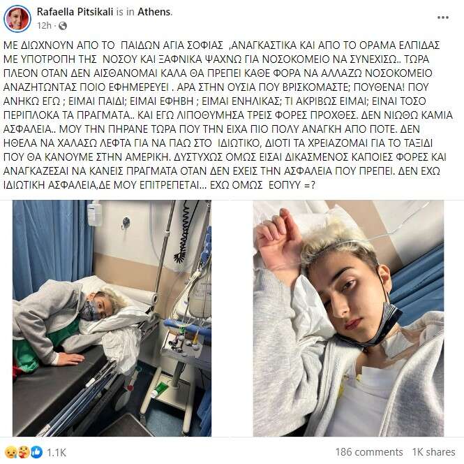 «Με διώχνουν από το παίδων “Αγία Σοφία” ,αναγκαστικά και από το όραμα ελπίδας με υποτροπή της νόσου και ξαφνικά ψάχνω για νοσοκομείο να συνεχίσω.. τώρα πλέον όταν δεν αισθάνομαι καλά θα πρέπει κάθε φορά να αλλάζω νοσοκομείο αναζητώντας ποιο εφημερεύει . άρα στην ουσία που βρισκόμαστε; πουθενά! που ανήκω εγώ ; είμαι παιδί; είμαι έφηβη; είμαι ενήλικας; τι ακριβώς είμαι; είναι τόσο περίπλοκα τα πράγματα.. και εγώ λιποθύμησα τρεις φορές προχθές. δεν νιώθω καμία ασφάλεια.. μου την πήρανε τώρα που την είχα πιο πολύ ανάγκη από ποτέ. δεν ήθελα να χαλάσω λεφτά για να πάω στο ιδιωτικό, διότι τα χρειάζομαι για το ταξίδι που θα κάνουμε στην Αμερική. δυστυχώς όμως είσαι δικασμένος κάποιες φορές και αναγκάζεσαι να κάνεις πράγματα όταν δεν έχεις την ασφάλεια που πρέπει. δεν έχω ιδιωτική ασφάλεια, δε μου επιτρέπεται έχω όμως ΕΟΠΠΥ».